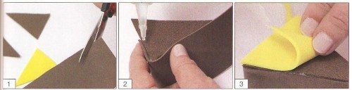Comece cortando o molde e unindo ele com cola instantânea. Primeiro faça isso com a parte marrom e depois use o amarelo que é a cobertura.